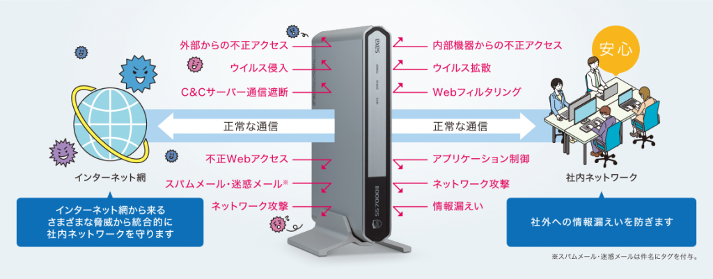 UTMとは、Unified Threat Management(統合脅威管理)の略。複数の異なるセキュリティ機能を一つのハードウェアに統合し、ウイルスなどの脅威に対抗するためネットワークを管理します。